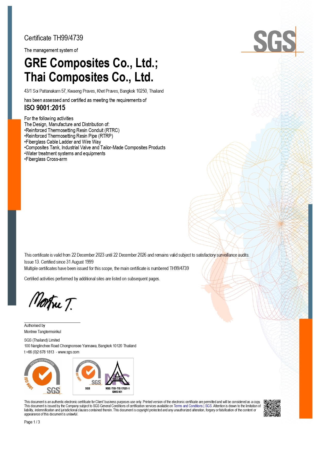 Thai Composites Company Limited was established in 1999 to manufacture Reinforced Thermosetting Resin Conduit (RTRC) to substitute the import of conduit from Canada under the GRE trade mark.