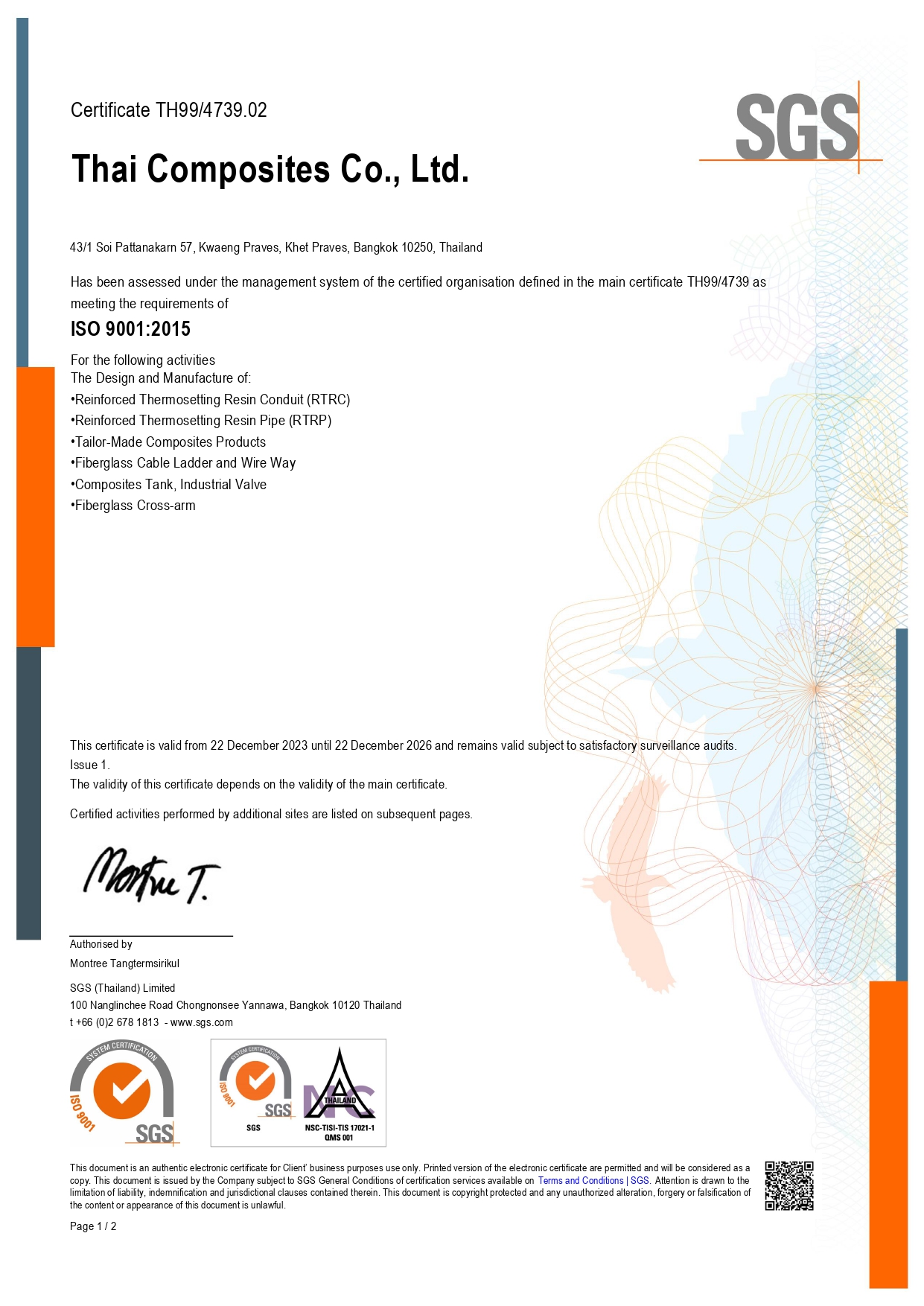 In the year 2000, TCC has implemented the ISO system to improve , control and develop the quality of work and production. In the year 2002, TCC has earned and received the ISO 9001:2000 certification. In the same year, we increased the production of FRP pipe to launch in the industrial systems, water supply systems, waste water treatment systems. All pipe has been designed and comply to TIS. 1483-2549, TIS. 1484-2540 and TIS. 1485-2540 respectively.
