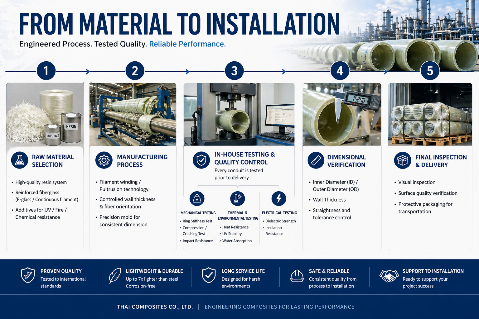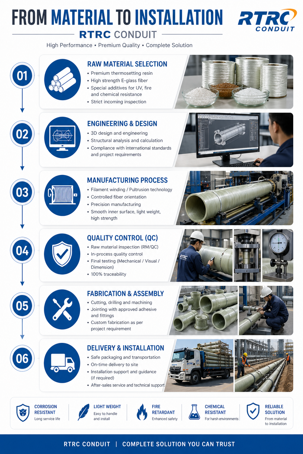 All RTRC conduit systems are tested for mechanical strength, impact resistance, and environmental durability in accordance with international standards.